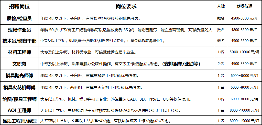 福利待遇:五險一金\各類補(bǔ)貼\培訓(xùn)\包食宿\體檢等。